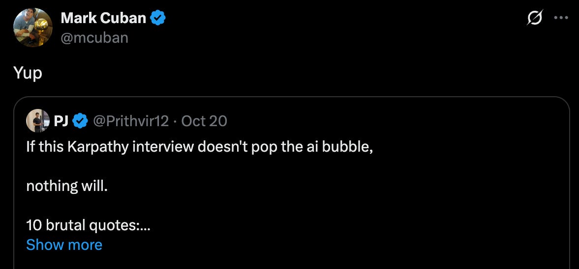 The reaction to the Karpathy interview is fascinating. Mark Cuban apparently signed onto the idea that it should throw cold water on current AI investment.